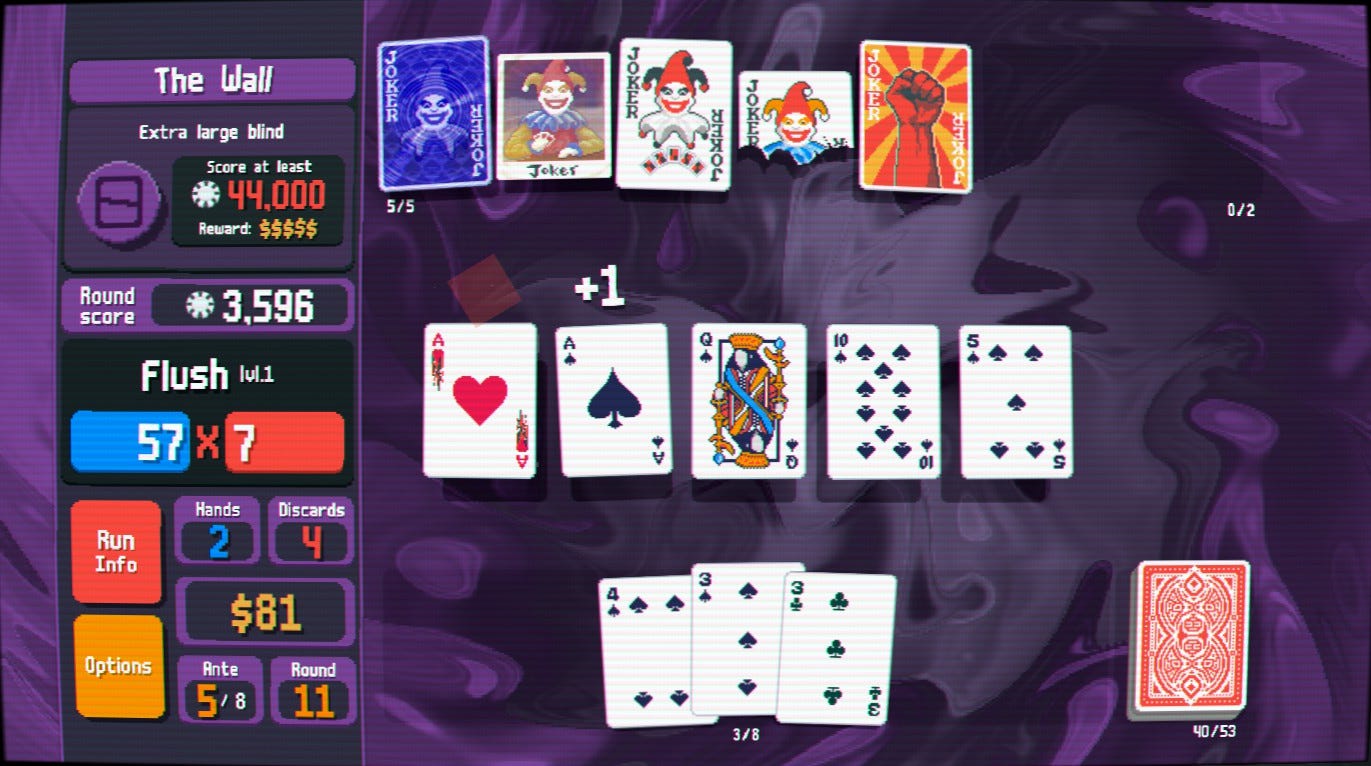 The core gameplay is very simple. You make poker hands. Got two eights? Make a pair, get 50 points. If it were only that, the game would get old quickly. There’s only so many times you can make a double pair before you turn the game off and go do laundry, but that’s where the Jokers come in.