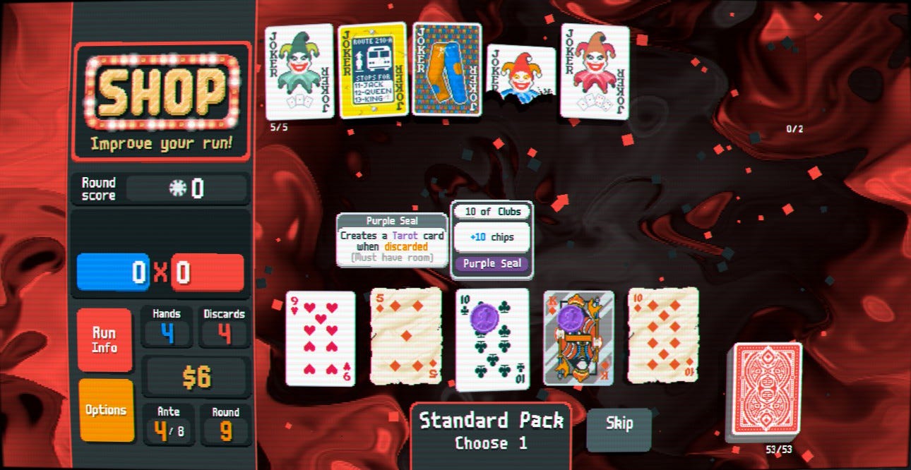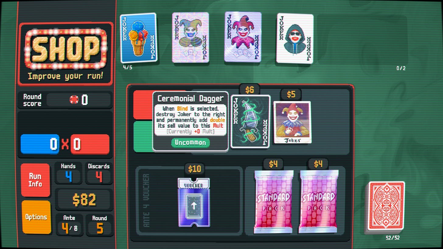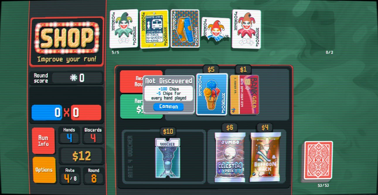These cards, and other goodies, can be bought at the shop. After each round you go to the store, where you can spend your hard-earned money. There are booster packs, one for each kind of card, which you open and select from a random group of cards. There are vouchers, which are buffs that last through the whole run. Things like adding an extra card to each hand, adding an additional hand to each round or increasing the money you get from interest. You can also buy individual cards, if they show up.