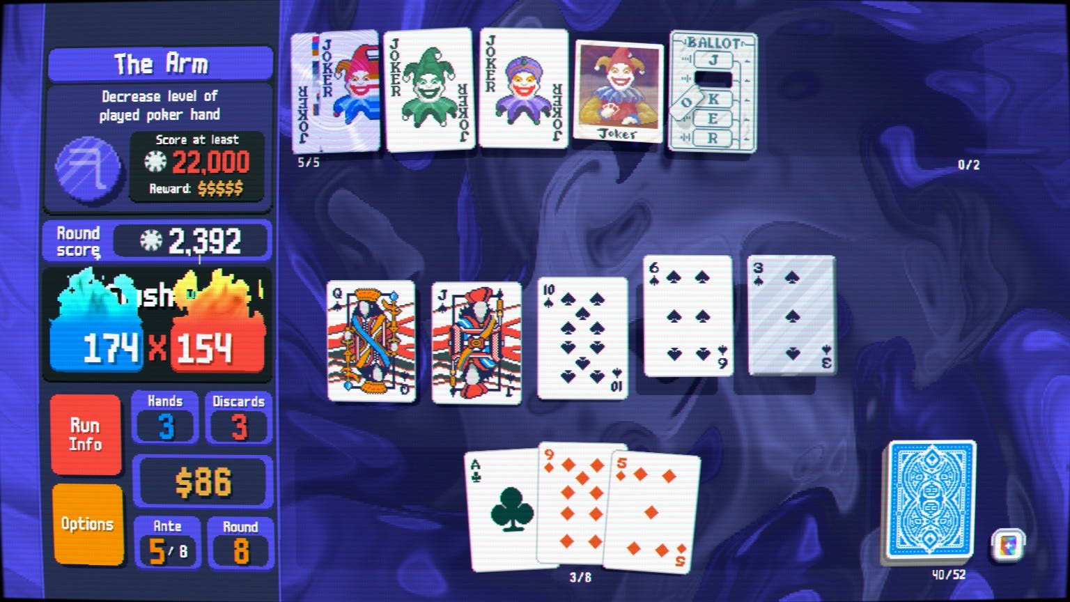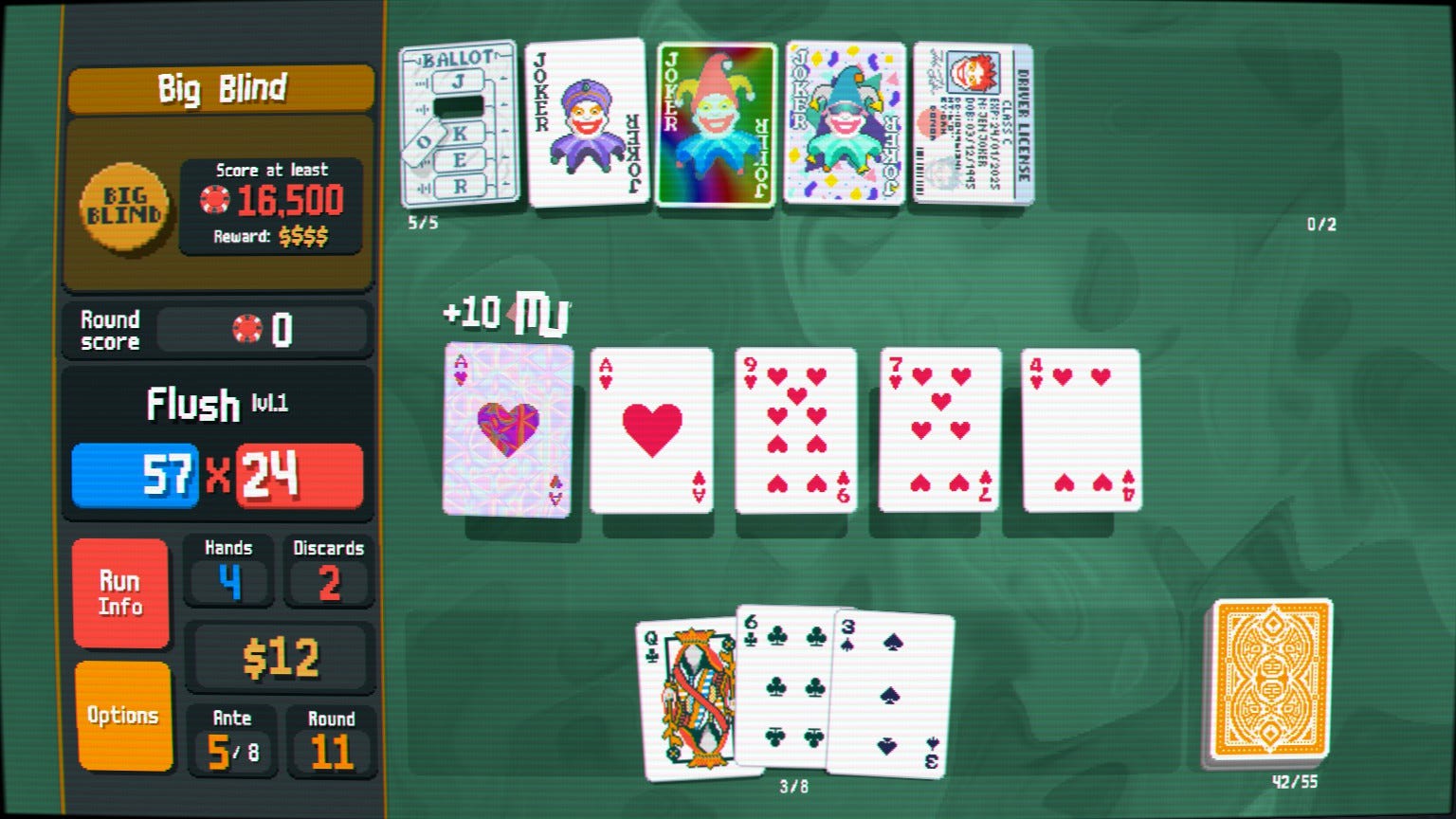 The system itself is intuitive, simple and has a few variables to manipulate. It’s like the one in Tony Hawk’s Pro Skater: You have a base amount of points that gets added and a multiplier which, as the name suggests, multiplies the base. The resulting number is your score. Card combinations give a base score, while the cards’ value is added on top. Each hand has a set value and multiplier, with more difficult hands having a higher payout. A pair, for example, gives 10 points and a multiplier of 2. If you play a pair of 5s, you get 10 points for the hand, plus 5 for each five played, then it all gets multiplied by 2, for a total of 40 points. It’s a little wordy if explained in text, but all you need to know is number on the left gets multiplied by the number on the right, and there are a lot of ways to make each of them bigger.