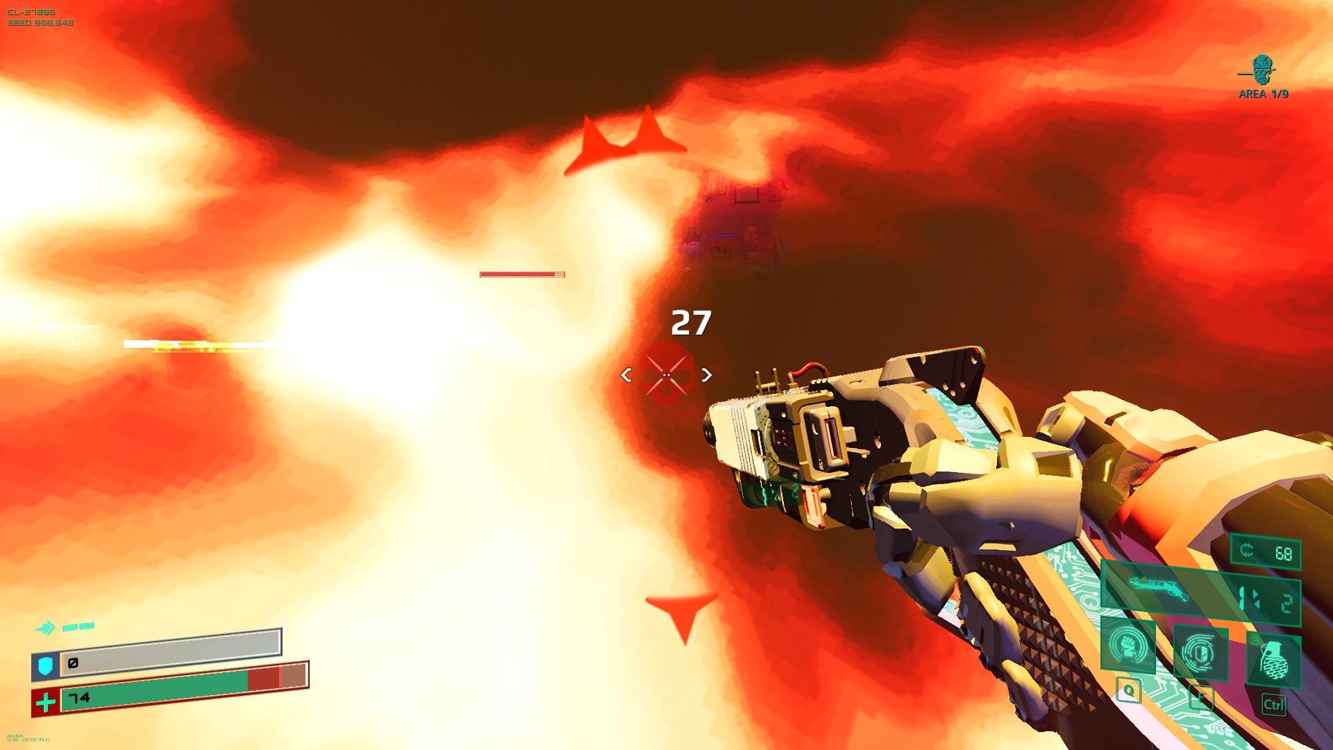 Movement is another way to avoid damage. You move at a regular pace, but you have a dash, which can also be used in the air. The dash is short ranged, but it’s enough to get you out of the way of enemy shots, since they’re projectiles. Circle strafing around enemies is very effective. You’ll be moving around a lot to collect ammo, resources and to get into better positions to attack. The game encourages constant movement, and rewards you for doing it well.