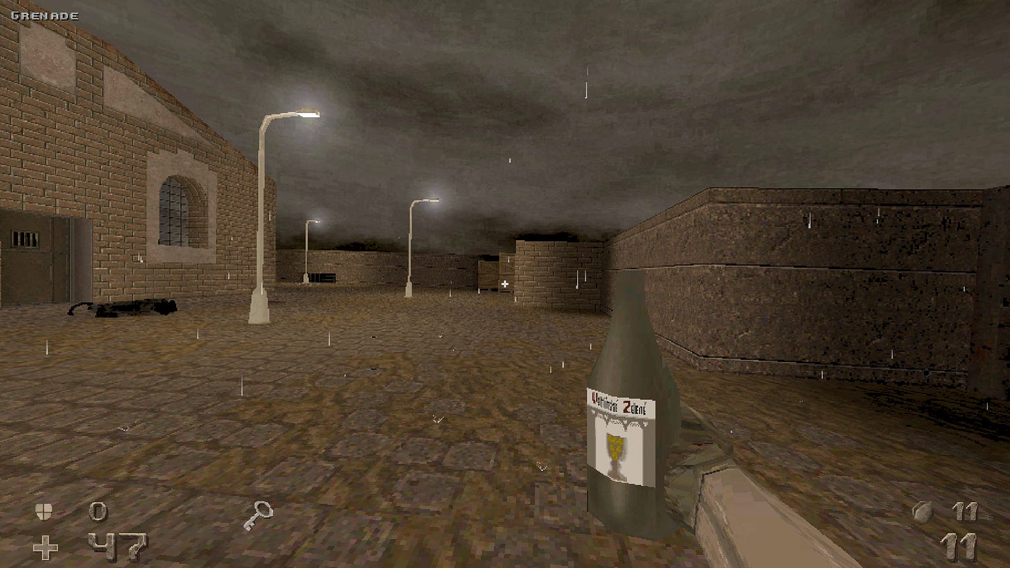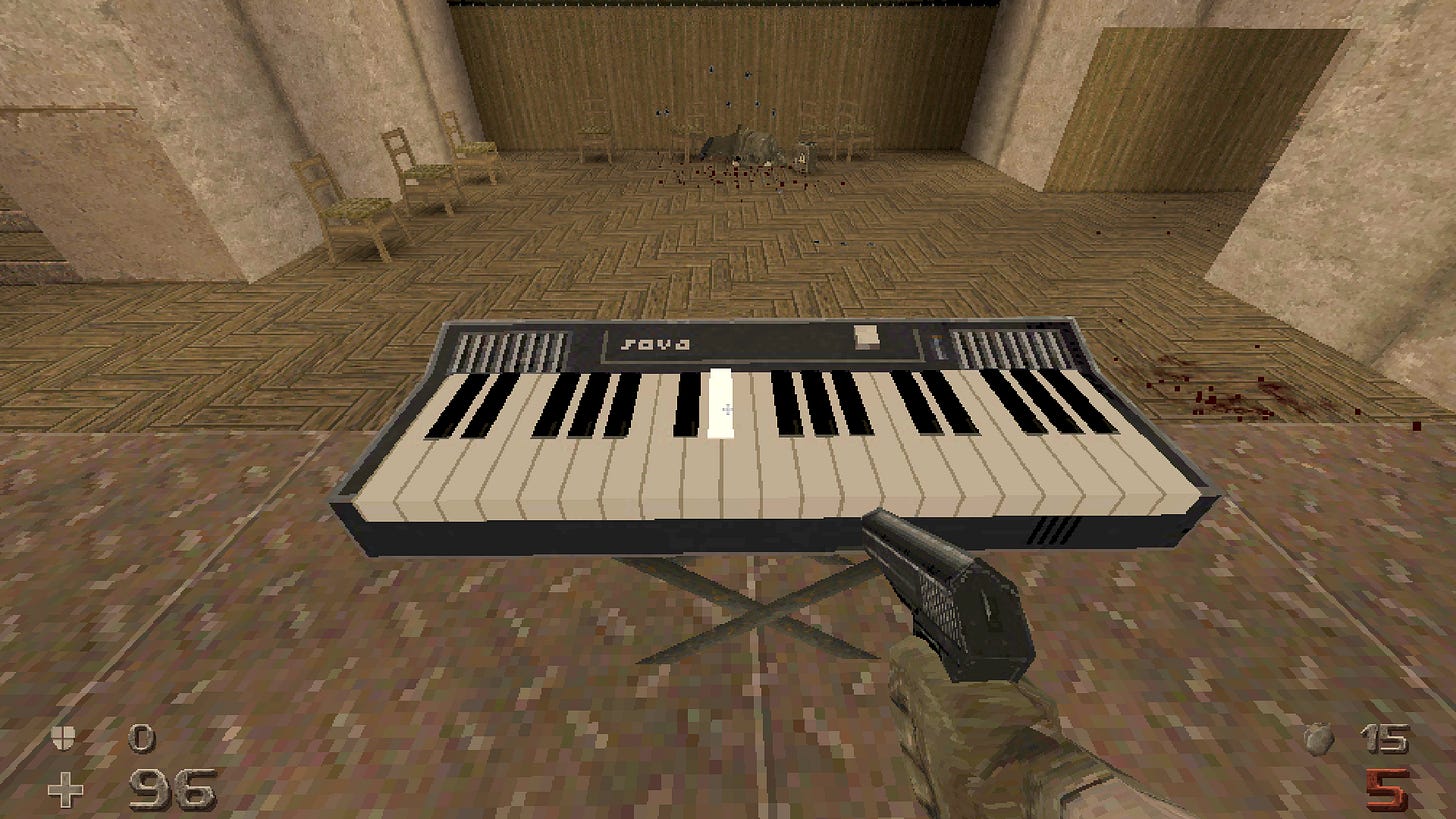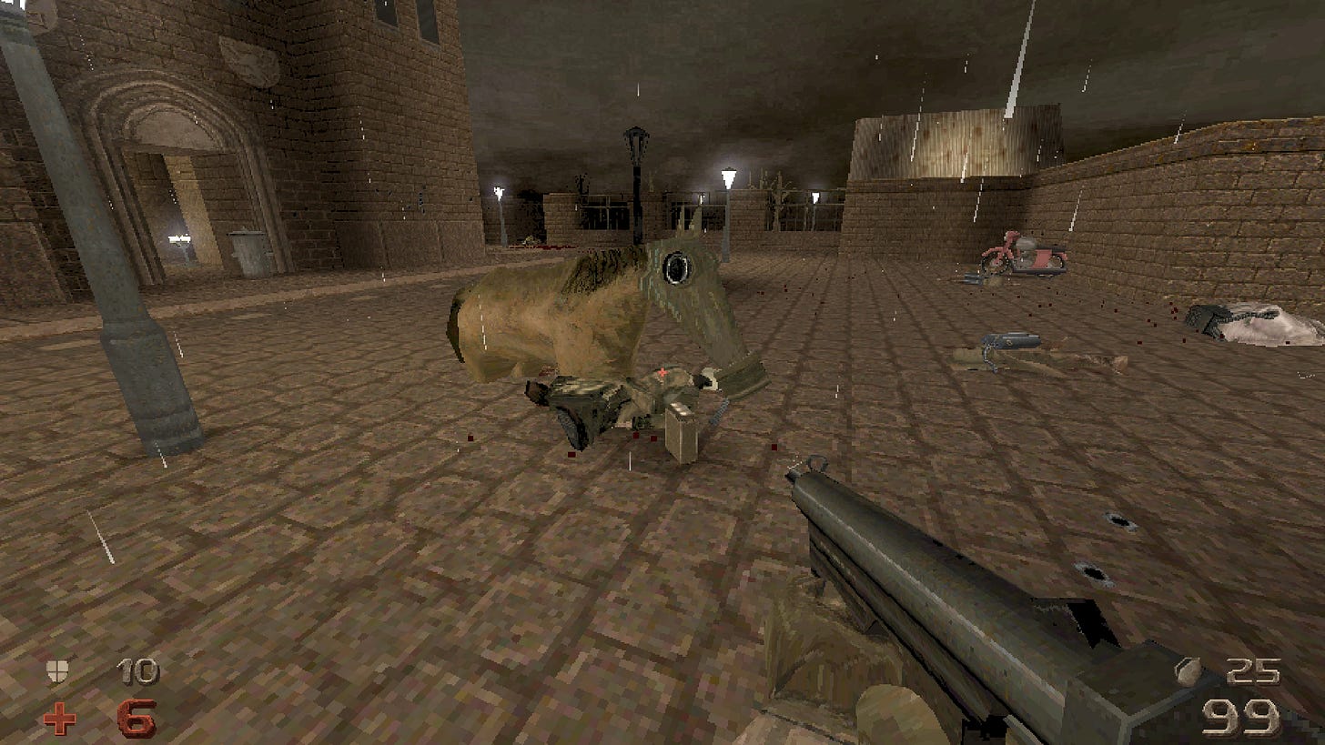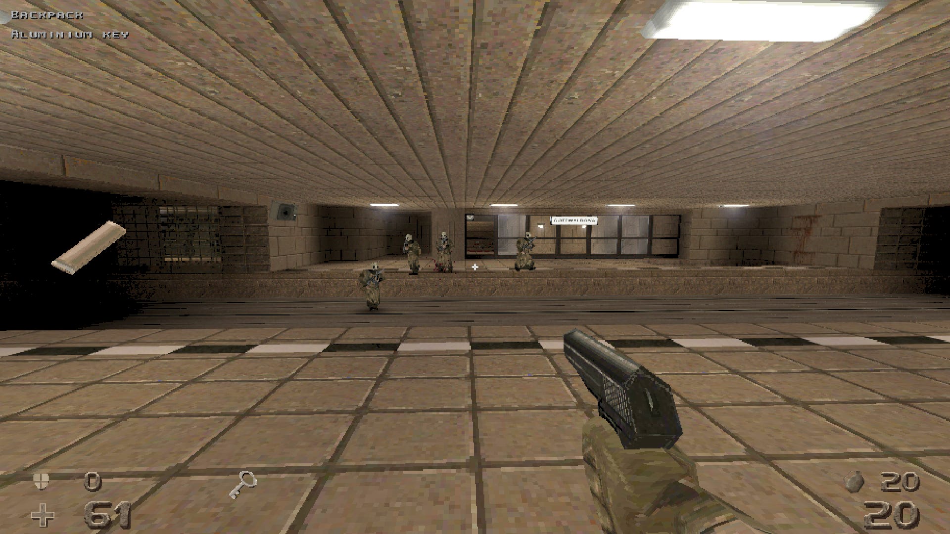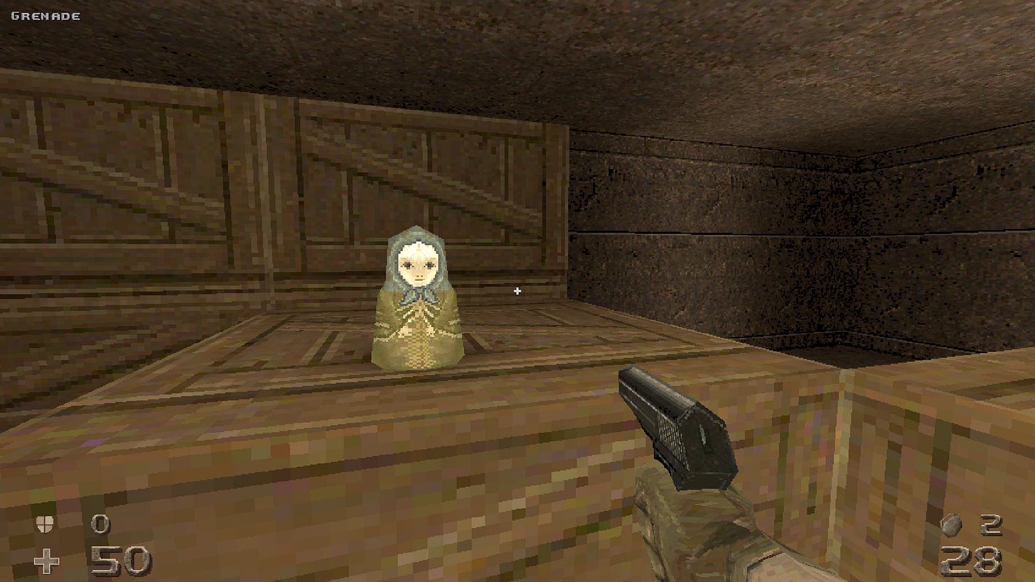 It deliberately invokes the games of years gone by with a low poly look. Enemies are big, boxy things with less vertices than pixels. The textures are low-resolution and rough. You can see individual pixels. To add to the retro look, the game has built-in jitter to give it that unsteady look some older games had.
