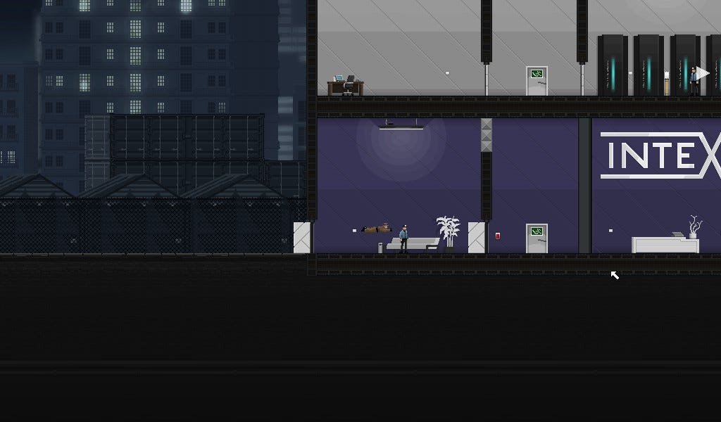 Gunpoint goes for a sleek style. It’s detailed enough to be interesting and convey information, without being too busy, cluttered or visually noisy as to be a distraction. It looks kind of like a flash game, which isn’t a bad thing, but it’s not the latest in graphics technology, so investors won’t want anything to do with it. Even if you sneak into the shareholder’s office and download their browsing history.