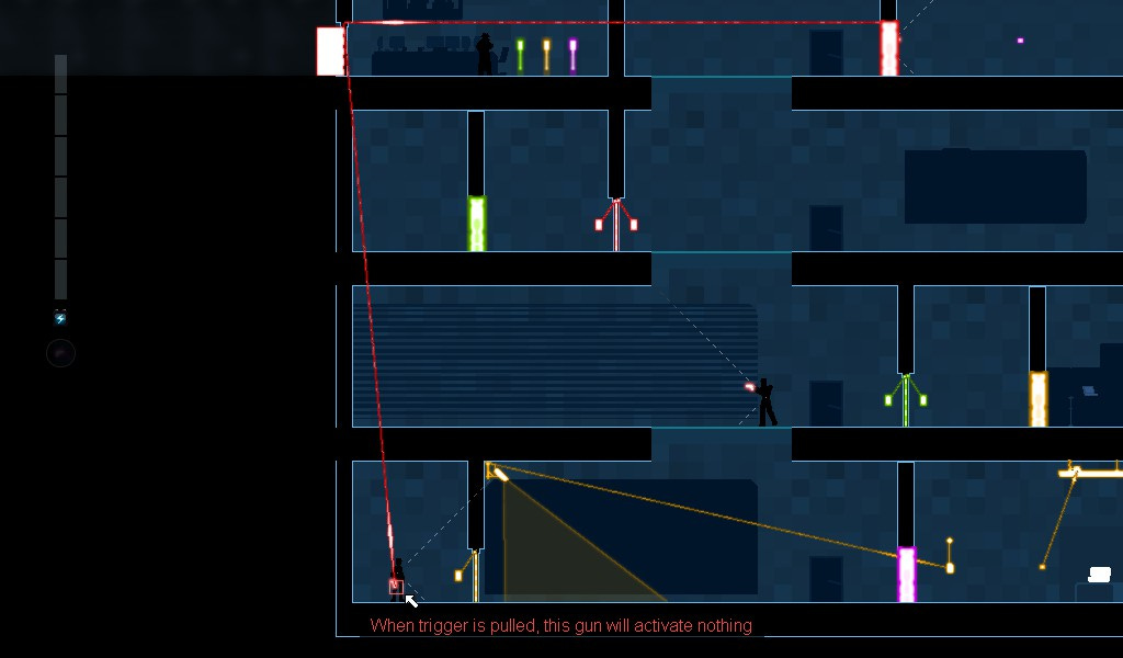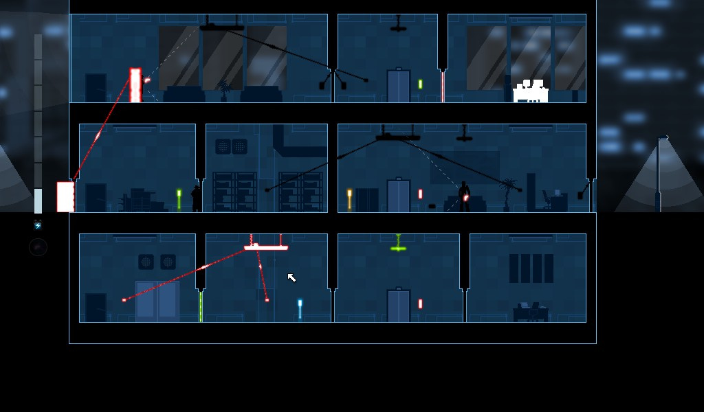 Each level has an objective you have to reach. It’s usually locked in a room inside the building. You can see every room at all times, and you can see all the electronics and how they connect to each other. Your first step is usually to enter the building. Find the right door and get in. Next, find the room with the control modules. Hack those, and you can take control of the security system. Next, use the system to your advantage. You can change connections and mess with circuits. You can take a security camera, hack it and make it open a door instead of activating an alarm. You can even hack a guard’s gun to and have it negligent discharge when something else triggers it.