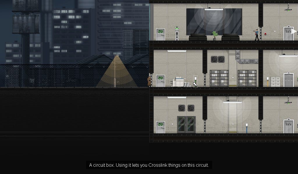 Gunpoint is a 2D stealth puzzle game. You play as a corporate spy who takes missions to go into offices and steal company secrets. Break into the building, hack the terminals and manipulate the security system to do what you want. Then, sneak around, avoiding guards and disabling lights to get your prize and escape. You can be a ghost and avoid detection, or go feral and smack all the guards while making a racket.