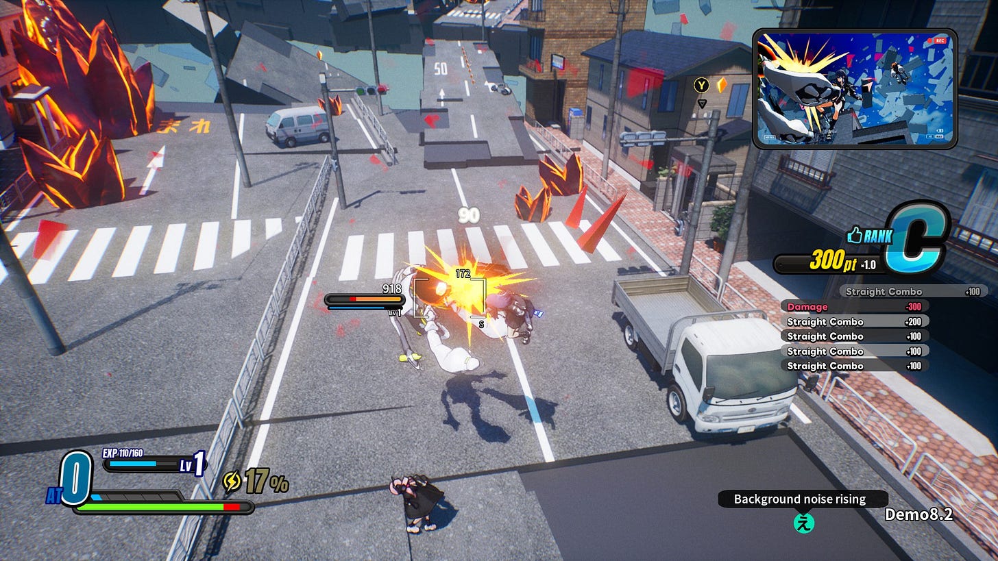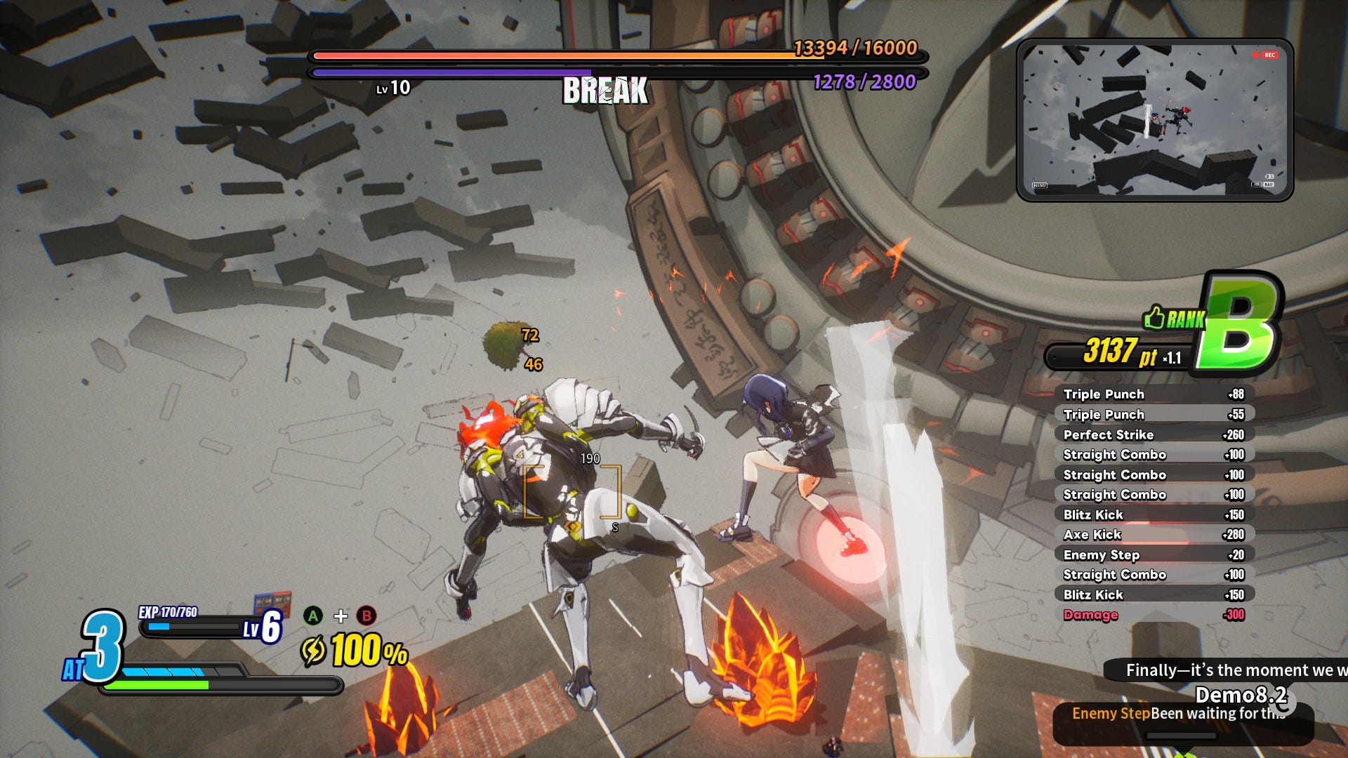 The bosses in Assault Spy had a similar mechanic, but once they were in break, you could smack them around and get stylish. They could still attack, but only if you left them alone. The boss in the MIGHTREYA demo attacks like nothing’s happening. It honestly feels like a bug. It’s not supposed to do that. You smacked him into break, you should get to beat him down for a bit and show off. The break timer is already laughably short, so it seems like you’re supposed to have a few seconds to unleash your most damaging combo, not mash away hoping the boss doesn’t swing at you while you’re readying a punch.