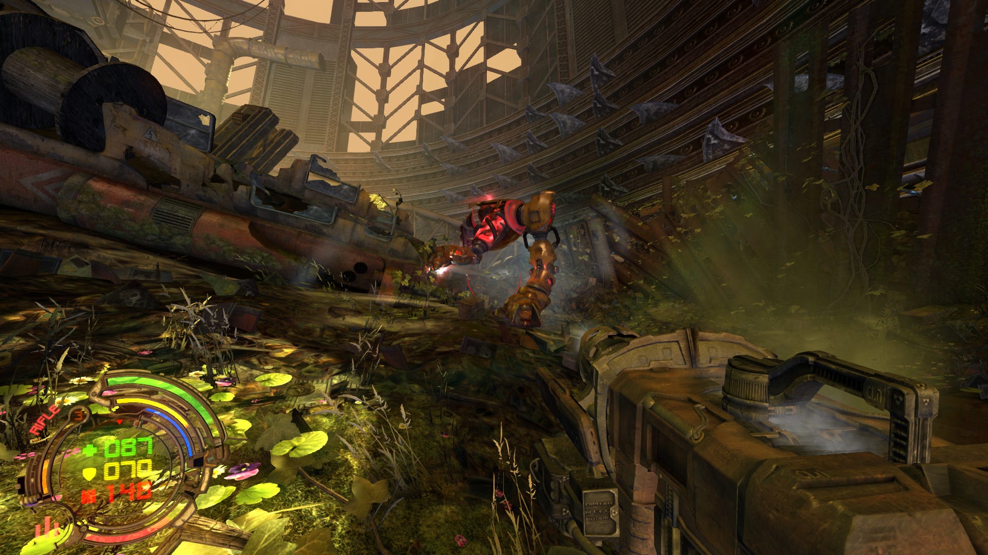 The enemies in Hard Reset suck, too. There are around 6 enemy types, and they all bring their own flavor of frustration. They range from tiny robots that run at you to giant bugs that constantly fire missiles. None of them react to your shots and most take ages to kill.