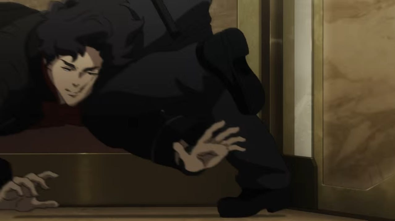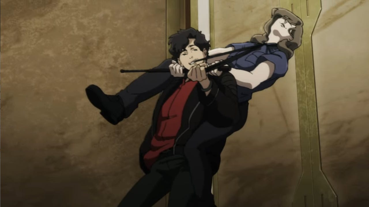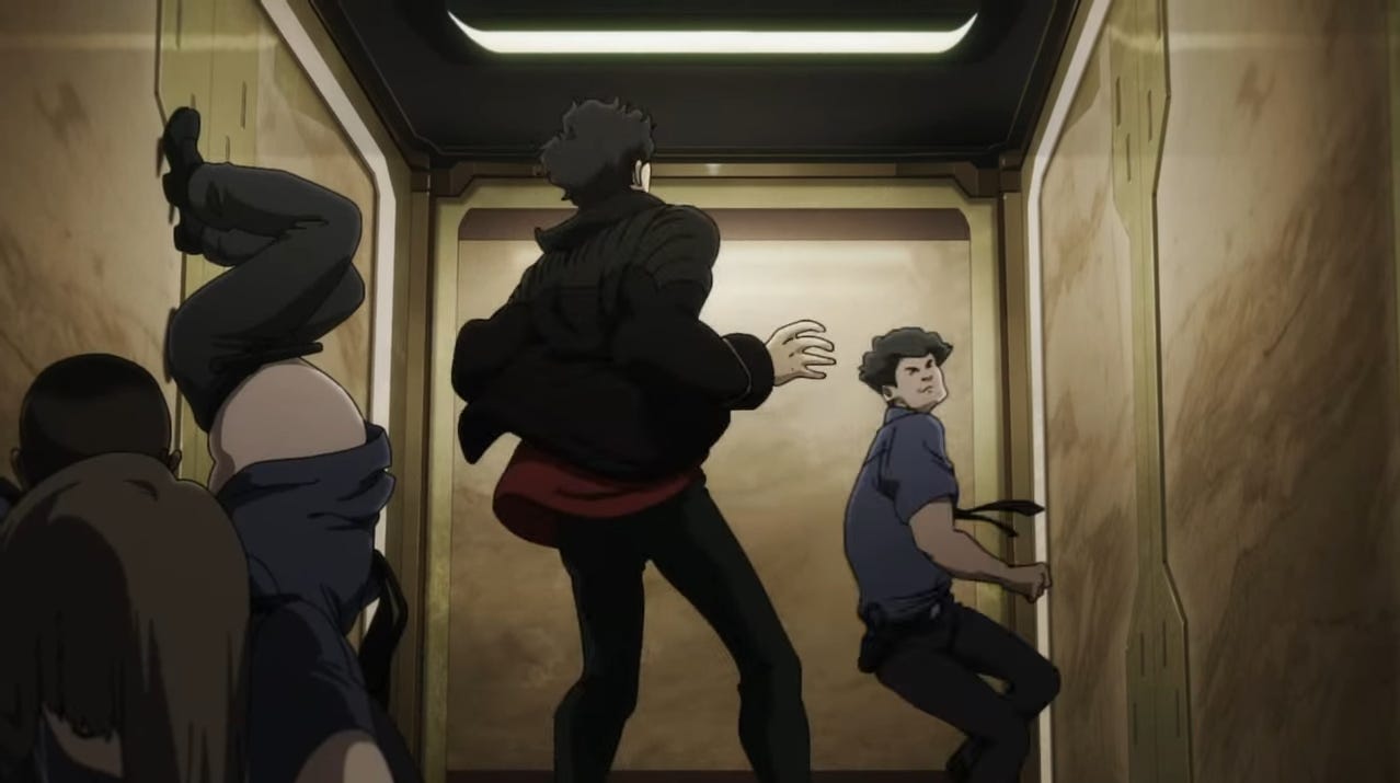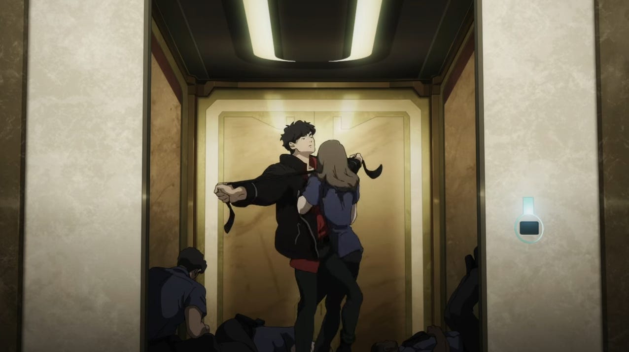 After that bodice-ripping setup, we get an insert shot of another main character saying something in Japanese. I’m sure it’s something important to the plot, or a funny, Marvel-style quip. “I hope Axel is retrieving the thing he needs and not having intercourse in an elevator”. I need to workshop that one. That’s his name, by the way. Axel. Not the guy quipping, Axel is the guy in the elevator. He’s Jesus. More on that later. Back to the elevator love scene- I mean- fight scene.