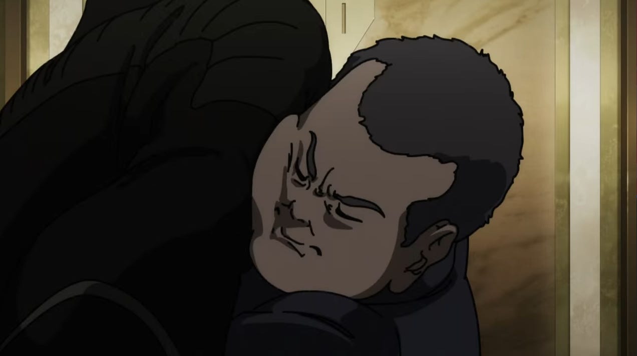 This scene is bizarre and incredibly funny to me. The weird way in which it starts, the unfitting music, the janky animation, the way everyone morphs around from pose to pose, the baffling direction. There’s a solid chunk of the scene that’s spent from the perspective of the wall behind Alex, where 80% of the frame is covered by his back, and all you see are the two guards trying to bite him. It looks less like a fight scene, and more like an abstract mukbang video by David Lynch.